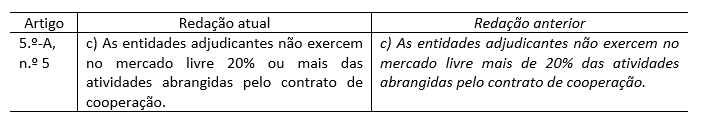 3. Relativamente aos contratos no âmbito do setor público, o legislador altera no pressuposto “percentagem das atividades abrangidas pelo contrato de cooperação”, de mais 20%, para 20% ou mais – harmonizando o regime português ao do Direito da União Europeia.