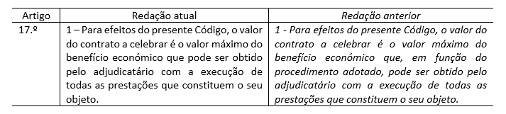 4. A definição do valor do contrato tem uma subtil alteração: retira-se a referência a que o valor máximo do benefício económico para o adjudicatário, está limitado pelo procedimento adotado. Como sabemos, os artigos 19.º e 20.º determinam o valor máximo do contrato em função do procedimento escolhido para a sua formação. O artigo 370.º, n.º 2, alínea c) impunha a proibição de execução de trabalhos complementares, quando o preço contrato somado ao preço atribuído aos trabalhos complementares excedesse os limites previstos no artigo 19.º, quando o procedimento adotado tivesse sido o ajuste direto, o da consulta prévia ou o concurso público ou o concurso limitado por prévia qualificação sem publicação do respetivo anúncio no Jornal Oficial da União Europeia. Ora, claramente, em fase de execução do contrato, a soma do preço dos trabalhos complementares ao preço contratual, pode determinar a violação do limite do valor do contrato em resultado do procedimento pré-contratual adotado; fica a questão se a entidade adjudicante quando fixa o valor do contrato com a aprovação da sua despesa inicial, tem de incluir nesta o valor máximo dos trabalhos complementares, ou pode deixar para a fase da execução do contrato, a aprovação da despesa que exceda o valor do contrato aprovado com a decisão de contratar.